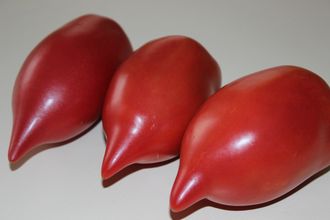 Красивый сорт, формирующий плоды довольно необычной – удлинённо-цилиндрической формы с изящно загнутым носиком. Томаты малиново-розовой окраски, достаточно плотные, устойчивые к растрескиванию, превосходного вкуса. Средняя масса плода – 200-250г, первые плоды могут иметь удлинённо-сердцевидную форму и вес до 400г. Куст высотой 1,6-1,8м. К достоинствам сорта можно также отнести его высокую урожайность и длительный период плодоношения. Для ОГ и теплиц