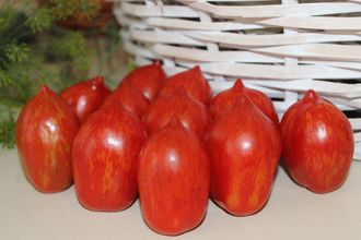 Высокорослый, среднеспелый сорт с длительным плодоношением. Плоды плотные, красивой формы -грушевидные с носиком, весом около 70 гр., красные с оранжевыми полосами, собраны в очень большие кисти. Вкусный, богатый и приятный аромат.