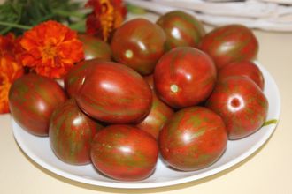 Высокорослый, среднеспелый сорт с очень высокой урожайность. Куст крепкий, можно вести в 3 стебля. Плоды красно-коричневые с зелѐными узорами, овальные, в кистях до 15 плодов весом 30-40 гр.Очень плотные, без трещин, лѐжкие, вкусные, кислинка присутствует.