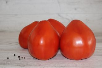 Индетерминантный, среднеранний сорт, растения высокие, стебель толстый, твердый, со срединными и длинными междоузлиями, хорошо покрытый листьями. Соцветия образуют 3-5 плодов, со средним весом 500 грамм, или весом от 350 до 800 грамм. Плоды сердцевидные, интенсивно глубокого красного цвета, крупные, мясистые, сладкие и полны свежего томатного вкуса, с нежной кожицей.