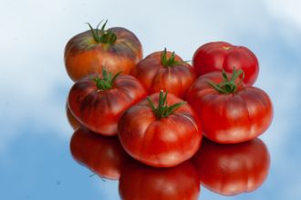 Высокорослый, среднеспелый сорт, который не только красив, но и удивительно урожаен. Плоды очень декоративны, оранжево-красные с антоцианом, весом 100-200 грамм, сочные, вкус сбалансированный, кислинка слабо выражена. На нижних кистях, находящихся в затенении от листьев антоциан не проявился.