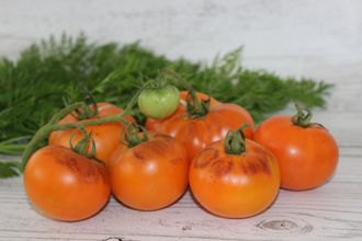 Высокорослый, среднеранний. Помидоры насыщенного мандаринового цвета с чернильными пятнами на плечиках. Антоциан сильнее проявляется к концу сезона, когда наступают более прохладные дни. Масса подов 150-180 грамм, форма ровная, плоскокруглая. Необычный леденцово-сладкий вкус. Назначение салатное. Встречается с названием Солнечный свет.