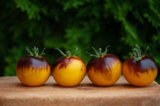 Среднерослый, среднеспелый. Плоды круглые, массой по 90-150 грамм, окраска уникальная — чёрная возле плодоножки, середина нежно-коричневая, а вершина плода оранжево-медовая, в разрезе светло-жёлтые, плоды очень вкусные, сладкие с фруктовой кислинкой. Очень красивый и урожайный сорт
