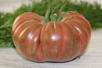 Высокорослый, среднеспелый, крупноплодный сорт. Плоды тёмно-малиновые в зелёную полоску с небольшой ребристостью у плодоножки, весом до 400 грамм. Мякоть сочная и плотная с приятным вкусом. Очень хорошее плодоношение с середины сезона до морозов. Хорошая устойчивость к кладоспориозу.