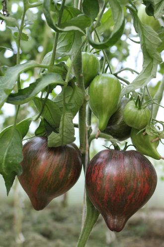 Высокорослый, среднеранний, очень урожайный сорт. Куст тонкий, лист редкий, томаты сердцевидной формы с изящным носиком, весом около 200 гр. красивой экзотической окраски, шоколадного цвета с антоцианом на плечиках. На разрезе темные, вкус насыщенный фруктовый. Можно выращивать в 2-3 стебля. Автор сорта Blan Horton, США.