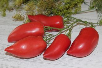 Среднепоздний сорт, в теплице высотой около 2 метров, привлекает внимание красотой и формой плодов. Томаты остроконечные, перцевидные, массой 130-150 грамм, имеют мало сока и семян, в кисти 5 и более плодов. Вкус очень тонкий, ароматный, фруктовый, сладкий и сбалансированный.