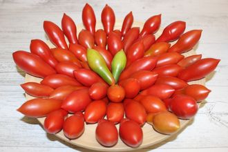 Индетерминантный, среднеспелый, урожайный сорт. Стебель лиановидный, со множеством красивых кистей. Плоды пальцевидные с красивым носиком, плотненькие весом 35 -40 грамм содержат мало геля, сладкие, вкусные. Рано вступил в плодоношение, но полной мере раскрылся к концу сезона.
