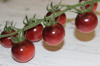 Индетерминантный, очень урожайный сорт. Куст крепкий, хорошо облиственный. Завязываемость отличная, в числе первых вступил в плодоношение и до заморозков весь в красивейших кистях с пурпурными плодами с антоцианом. Вкус яркий, свежий, очень приятный. Вес томатов 10 -12 грамм. Недостаток: очень урожайный))).