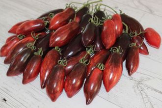 Очень красивый и вкусный сорт. В теплице высокий, среднеранний, очень урожайный, долго плодоносит. Плоды декоративные, удлиненные сливки, малиново - розового цвета с густым фиолетово -черным напылением и острым носиком, массой 50 -80г, плотные, сладкие. Сорт устойчив к перепадам температур, отличная завязываемость плодов.