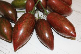 Нарядный, интересный сорт, в теплице 1.7 метра. Плоды сливовидные с вытянутым носиком массой около 50 грамм, шоколадно-бордовые с мраморной росписью, стеночка толстая, гель густой, мякоть на разрезе вишневая. Вкус хороший, яркий, интересный. Назначение: свежее потребление, консервирование, вяление.