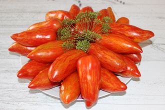 Замечательный среднеспелый, ОЧЕНЬ урожайный сорт. Куст высотой около 50см, лист обычный. Плоды массой до 100-120г, красивые, длинные сосульки, как правило – с тупым носиком, ярко-красного цвета с золотистыми штрихами-полосками. Из-за такой «тигровой» окраски кусты смотрятся очень нарядно. Плотные, лежкие, хороши для консервирования, не растрескиваются. Мякоть ароматная и слегка суховатая, во вкусе есть небольшая сладость, эти помидоры хорошо подходят для приготовления соусов, гарнира, рыночных продаж.
