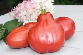 Высокорослый, очень интересный и необычный сорт. Кисть состоит из 4-5 плодов в форме груши, привлекая внимание очень большим размером томатов. Завязываемость плодов очень хорошая, без пропусков. Среднеспелый. Вес томатов около 250 грамм. Плоды плотные, мякоть вкусная, сладкая, одно мясо. Семян очень мало. Плодоношение до поздней осени. Пригоден для консервирования, приготовления соусов.