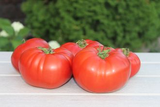 Растения высокорослые, среднеспелые. Плоды плоскоокруглые, с легкой ребристостью по плечам, огромные, мякоть плотная, маслянистая, вкус великолепный сладкий. Завязываемость плодов хорошая. Сорт отличается высокой урожайностью. С одного плода тазик салата. Отличный вариант для приготовления салатов, соков, всех видов переработки. Суперсорт!.