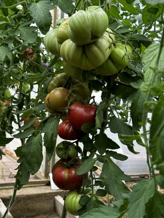 Высокорослый сорт с потрясающей урожайностью, плоды огромные, их собираешь, на их месте растут новые и новые! Это нечто, кисти ломятся от урожая! Удивил вкусом: мякоть сахаристая, сладкая. Плодоношение длительное, до заморозков.