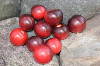 Высокорослый, среднеспелый, урожайный сорт. Куст не раскидистый. Плоды розово-красного цвета, овальные, с блестящими фиолетово - чёрными бочками, сладкие, плотные. В кистях до 10 плодов. Созревание дружное. Подойдет и для свежего потребления и для цельноплодного консервирования.