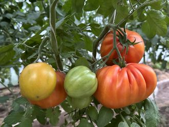 Высокорослый, среднеспелый сорт, плодоношение продолжительное, до конца сезона. Помидоры желто-оранжевые, увесистые, плотные плоды в форме торбы, массой до 400 г, мякоть качественная, желто-красная мраморная со сладким вкусом. Назначение салатное.
