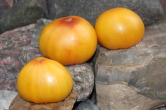 Среднеспелый, высокорослый, инд. сорт с длительным периодом плодоношения. Выровненные, крупные, мясистые, малосемянные, вкусные плоды с розовой шапочкой и лучами, весом 300-500 грамм и более, с уплощенными плечиками. Пестрые оттенки желто-оранжевого и красного. Мякоть плотная и сочная. Назначение салатное.