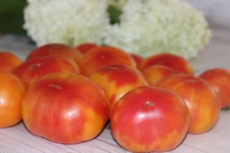 Высота растения в теплице 1,4 метра. Сорт среднеранний. Урожайность очень высокая. Плоды плоскоокруглые, желтого цвета с розовым оттенком и розовой шляпкой, мясистые, сочные, хорошего сладкого вкуса. Вес томатов 200-400 г.