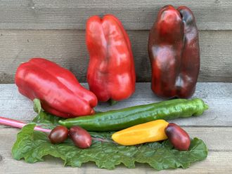 Высота около 60 сантиметров, в теплице может быть выше. Плоды огромные, длиной около 18 см, красно-бордовые весом до 400 грамм. Мякоть с толстыми стенками (8 мм), вкус мягкий, сладкий. Высокая урожайность во второй половине сезона. Для теплиц.