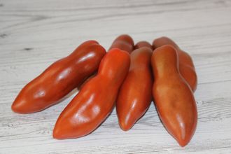 Индетерминантный куст, среднего срока созревания. Продуктивный - до конца сезона с плодами. Томаты, удлинённые с носиком, коричневые, с повышенным содержанием сухих веществ. В кисти по 6-9 плодов. Вкус хороший, в меру сладкий. Хорошо подойдут для консервации, вяления.