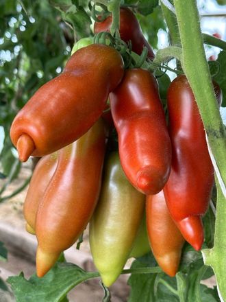 Высокорослый, среднеспелый сорт с хорошей завязываемостью плодов. Кисти удивительные, большие, плоды и висят, и торчат в стороны от тесноты. Томаты перцевидные, длинные, бордово-коричневого цвета, с носиком. Стенка толстая, мясистые, очень вкусные, сладкие! Урожайность высокая. Плодоношение длительное. Интересный, заметный сорт, что-то новенькое.