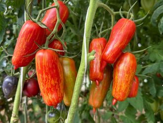 Индетерминантный сорт, шустрый, с активным ростом. Плодоношением до заморозков, кисти полные, красивые, много. Мякоть с повышенным содержанием сухих веществ, подойдет для вяления. Средний вес томатов 60 грамм, длина 10-12 сантиметров. Вкус приятный, не заслащенный. Урожайность очень высокая