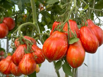 Высокорослый, среднеспелый с потрясающей урожайностью сорт стал украшением теплицы в этом году. Плоды интересной грушевидной формы с толстой стеночкой, массой от 150 до 250 г, мякоть густая, желейная, обладает приятным фруктовым вкусом. Плодоношение растянутое, признаков вершинной гнили не было. Назначение универсальное: сок или соус будут густыми, темного красного цвета.