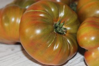 Новый сорт. Высокорослый сорт, среднеспелый, урожайный. Плоды плоскоокруглые, уплощенные биколоры зелено-розового-бордового разлива цвета, весом около 300 грамм. Мякоть нежная с фруктово-ягодным вкусом, тонким ароматом. Назначение салатное.