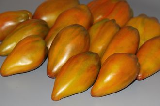 Куст стройный, малооблиственный, лианоподобный, плоды разнятся по форме, основной вес 100-150 гр, есть и более крупные. Окраска у плодов оливково-охристая с разлитым румянцем, в центре плотной, сладкой, радужной мякоти неизменный малиновый язычок. Урожайность высокая, было посажено два куста, разовый сбор только с одного куста заполнил ящичек.