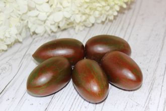 Растение индетерминантное, высокорослое с очень хорошей урожайностью. Темно-коричневые овальные плоды в зеленую полоску весом 50-70 граммов с небольшим носиком. Плотные, хрустящие. Вкус мякоти насыщенный сладкий с легкой кислинкой, пряным оттенком. Активное плодоношение до конца сезона.