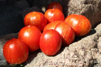 Растения высокие, до 1,8 метра в теплице. Кисть короткая, не перегибается, удерживая связки плодов. Томаты с яркой индивидуальностью, кубовидные с небольшим носиком, плотные, стенка толстая, но не сухая, мясистая. Вес в пределах 120-250 грамм. Мякоть густая, насыщенного цвета, приятная, сахарится на разломе, сладкая. Урожайность хорошая. Плодоношение длительное. Может использоваться для вяления.