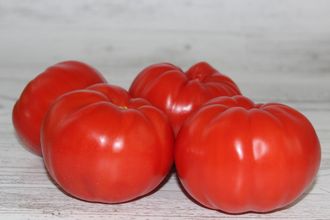 Индетерминантный, высокорослый (1,8 м), среднеспелый, очень урожайный сорт. Плоды крупные 400-700 и до 1 кг., красного цвета, присборены у плодоножки. Мякоть плотная, мясистая, малосеменная, вкус насыщенный, сбалансированный, сплошное «помидорное мясо». Урожай высокий.