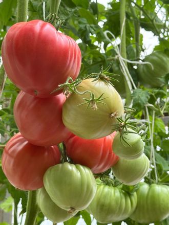 Среднеспелый, среднерослый, крупноплодной сорт томата. Плоды округлые, розового цвета с перламутровым отливом, небольшой ребристостью у плодоножки, массой 300-400 гр. Мякоть качественная, хорошей плотности, ароматная, вкусная. Показал высокую урожайность при формировке в 2 стебля, в теплице.
