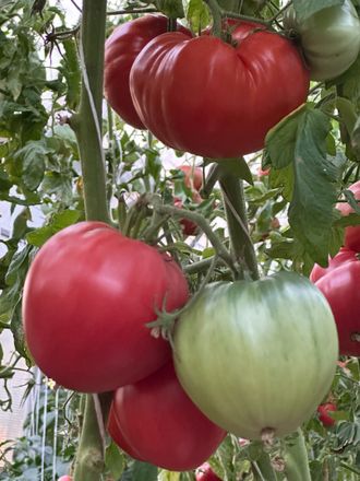 Высота 1,8 метра, сорт среднеспелый. При созревании плод имеет красно-розоватый цвет и хороший размер - средний вес томатов около 300 грамм. Мякоть ароматная, приятного кисло-сладкого вкуса. Сорт урожайный.