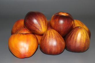 Индетерминантный, среднеспелый сорт. Куст в теплице более 200 см., лист тонкий, поникающий. Плоды сердцевидной формы с пышными плечиками, нежно-жёлтого цвета с розовым румянцем и мазками антоциана, массой 300-500 гр. Мякоть двухцветная, нежная, тающая, сладкая, семян практически нет. Суперсорт!
