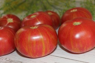 Среднеспелый, индетерминантный, высотой в теплице до 2 метров. Куст тонкого строения, но очень продуктивный, с хорошей завязываемостью плодов. Томаты весом по 60-70 грамм, плоскоокруглые, выровненные, нежного розового цвета с золотистыми полосками, не трескаются. Мякоть сочная, мармеладная. Вкус сладкий с легкой кислинкой и с ярким послевкусием. Очень урожайный. История сорта: Коллекционный сорт салатного назначения от Расс Кроу (США).