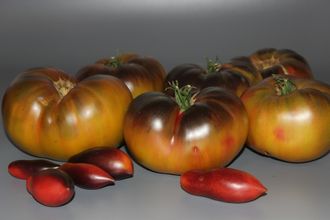 Высокорослый-1.8метра, среднеспелый с длительным плодоношением и очень высокой урожайность. Кисти огромные. Плоды большие, добротные, красивые биколоры с антоцианом, весом до 500-600 грамм, мелких не было вообще. Мякоть с сильным ароматом и фруктовым послевкусием, очень сладкая, на разрезе с мазками красного цвета. Салатный. На мой вкус это бомба, пушка)))! Удовольствие от выращивания получаешь. Селекция Софии Сааковой.
