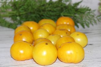 Плоды яркого жёлтого цвета в полоску, довольно крупные для карликов, весом 50-90 грамм. Такие мини-биф помидорки. Сочные, сладкие, с острыми цитрусовыми нотками во вкусе. Кустики крепкие, компактные, с морщинистыми картофельными листьями, высотой 50-60см. сорт подходит для контейнерного выращивания.