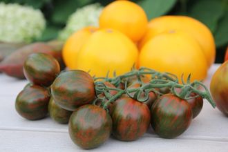 Плоды округлые или слегка овальные с очаровательным маленьким носиком, глянцевые, блестящие, фиолетового цвета с зелеными полосками, очень красивые. Мякоть сочная с интенсивным вкусом и ярко выраженным ароматом. Растение индетерминантное, высокорослое с простым листом. Сорт среднеспелый с отличной урожайностью.