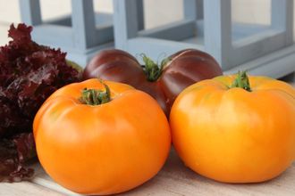 Индетерминантный, среднеспелый сорт. Куст в теплице 160 см., лист обычный, тёмно-зелёный. Плоды плоскоокруглой формы, оранжевого цвета, массой 300-500 гр. Мякоть мясистая, густая, кремовая, с мягким сладким вкусом. Супер-сорт!