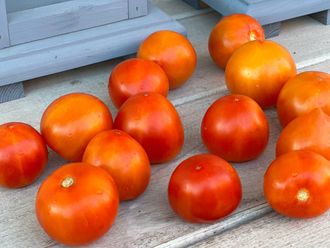 Интересный биколор: золотистый цвет с красным-розовым, кто победит зависит от интенсивности света. Плоды плотные и сочные, мясистые, толстая оболочка улучшает хранение, вкус сладкий на 5+. Не трескаются, имеют превосходную урожайность. Высота растений до 1,5 м. Заявленный вес плодов до 150 грамм, у нас были одномерными: 70-80 грамм. Подойдет для цельноплодного консервирования.