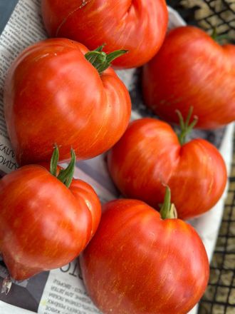 Среднеспелый, высокорослый, инд. сорт. Мощный, крепкий куст, не болеет, завязывает все плоды, даже при неблагоприятной погоде. Огромные, потрясающе красивые плоды, вытянутые сердца с длинным носиком, красно - оранжевые с золотыми лучами и разводами, сплошная плотная мякоть, практически без семян. Огромная урожайность до заморозков! Вес плодов на фото 450-600 грамм.