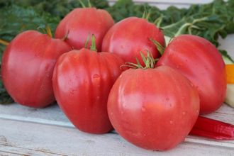 Индетерминантный, среднеспелый. Куст в теплице более 200 см. Плоды округло-сердцевидной формы, с продольными рёбрами, розового цвета, массой 400-600 гр. Мякоть мясистая, густая, плотная, прекрасного вкуса и аромата. Добавить хлебушка и «солюшки» с маслицем, и будет нам счастье! Запоминающийся, яркий сорт. Рекомендую любителям розовоплодных сортов!