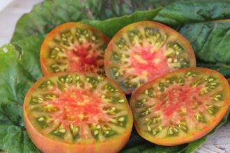 Индетерминантный, раннеспелый сорт. Куст в теплице 160 см., лист редкий, тонкий. Плоды округлой формы, красивые, триколоры, весом 150-200 гр. Мякоть с мраморным многоцветным рисунком, сочная, сладким и слегка пряным вкусом и насыщенным ароматом.