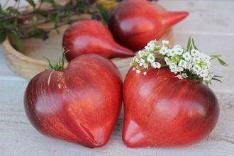Индет., среднего срока созревания. Плоды сердцевидные с носиком, массой 100-150 г. Очень красивые, розовый цвет, переходящий в огненно- алый с полосками и мазками анто. Мякоть сладкая, плотная, сочная. Куст вызывает восторг, когда плоды начинают спеть. Хорошая завязываемость плодов, активное плодоношение до конца сезона. Суперсорт.