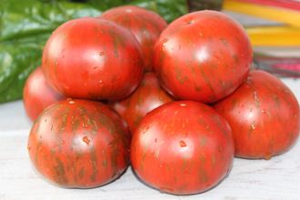 Высокорослый сорт с обильным и длительным плодоношением. Красивые красно-коричневые плоды с кожицей в яркую полоску. Приятная твёрдость и желейная внутренняя текстура с насыщенным сладким вкусом. Томаты абсолютно не подвержены растрескиванию, обильно плодоносят в течение сезона. Могут повисеть на ветках созревшими без потери качества. Хороши для свежего потребления, удобны для цельноплодного консервирования. Вес 60 грамм.