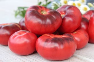 Высокорослый, среднеспелый сорт. Отличается необычно красивым внешним видом плодов - плоскоокруглые, малиново-фиолетового цвета с синим антоцианом на плечах, массой 250-300гр. Внутри малиновые, мясистые, сочные, имеют приятный томатный аромат, очень хорошего богатого вкуса, смесь сладкого и тропической кислинки, семян немного. На еду свежими, в салаты, соки и в консервацию.