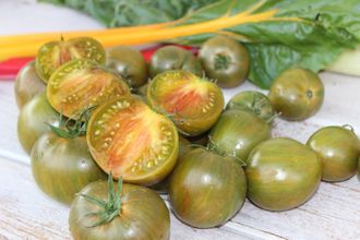 Высота куста 1,5 метра, среднеспелый, растения мощные, с превосходной урожайностью. Плоды светло-зеленые, пестрые с темно-зелеными полосками, с розовым и оранжевым загаром, мякоть от светло- до темно-вишневого цвета. Форма округлая, округло-сердцевидная. Вкус очень сладкий, сочные, не трескаются, могут хорошо храниться.