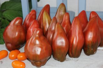 Высокорослый, среднего срока созревания. Плоды интересной вытянутой формы, шоколадного цвета с малиновыми и зелёными полосами, массой ~ 200-500г. Мякоть сахаристая, мясистая, малосемянная, с повышенным содержанием сухих веществ. Суперурожайный!!! Красавец!